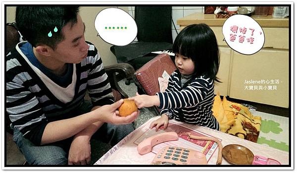 接著小蜜桃拿橘子給老公,她說:「壞掉了,爸爸修。」
