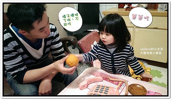 晚飯過後她看到桌上有一顆橘子,我們告訴她:「這顆橘子壞掉了哦!不可以吃。」