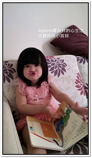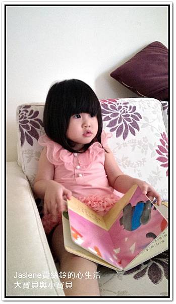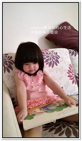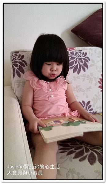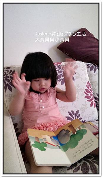 前天她拿「大房子與小房子」這本故事書,乖乖坐在沙發上自己看,還說故事給自己聽,
