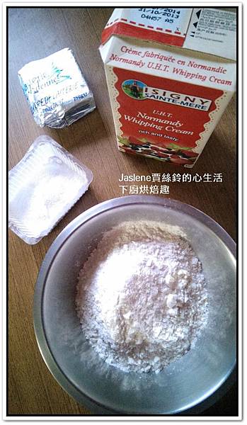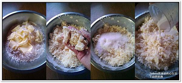 1. 中筋麵粉與發奶酵奶油(先撕成小塊,比較好搓揉,)一起混合成粗顆粒狀,再加入砂糖與鹽,拌勻之後慢慢倒入鮮奶油