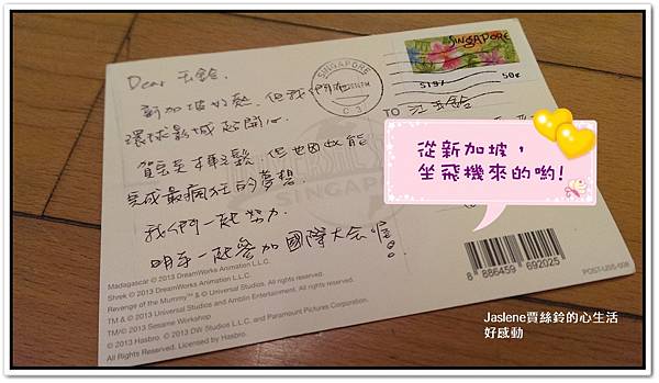 原來是上個月教練兒在新加參加國際大會的時候,寄給我的明信片。