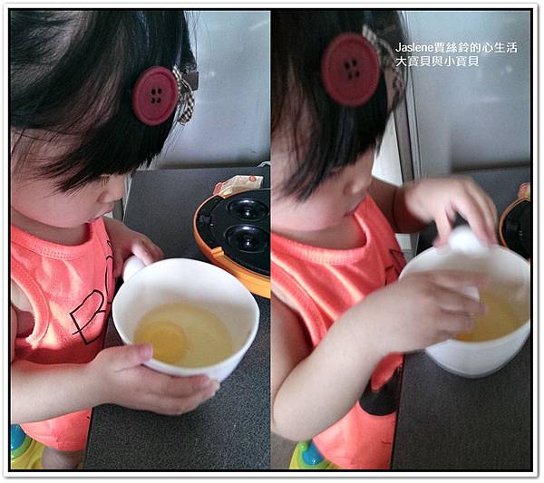 小蜜桃說:『要先打雞蛋哦!』,然後咚咚咚的跑去拿玩具雞蛋跟牛奶,