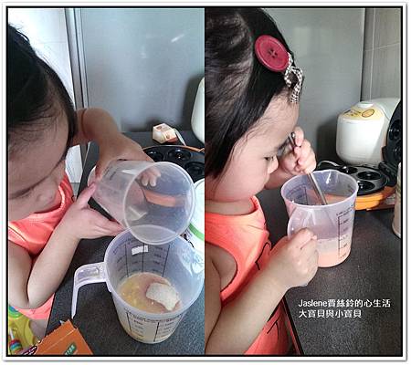 她自己挖草莓口味的兒童奶昔跟鬆餅粉加在一起