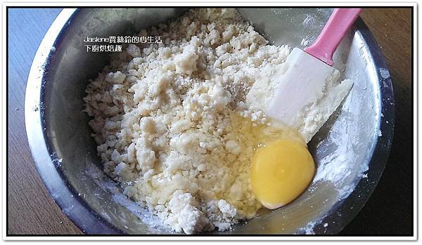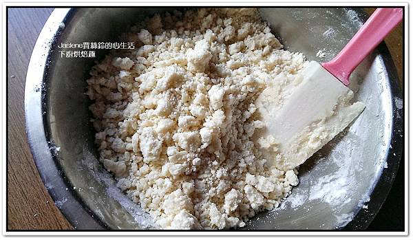 2. 加入麵粉用刮刀,以切拌的方式拌勻至沙顆粒狀