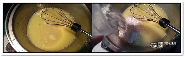 1. 先將發酵奶油切丁,除了玉米粉之外,其他材料全部隔水加熱,