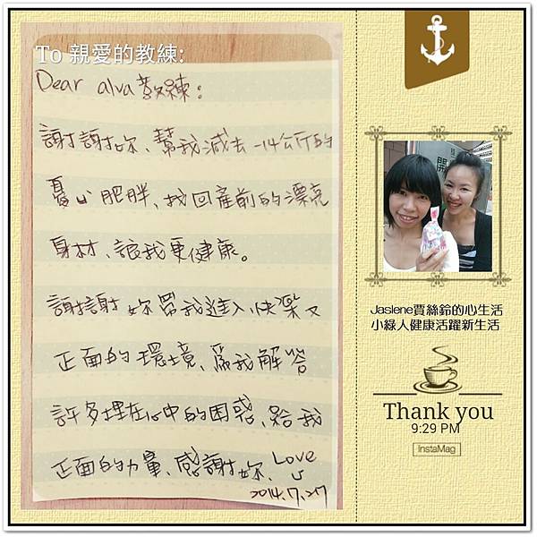 親愛的Alva教練,謝謝妳,幫我減掉14公斤,