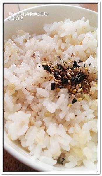 我用一個量米杯,裝了1/4的陽光糙米(圓糙米),再加2/4份小孩的米(益全香米),