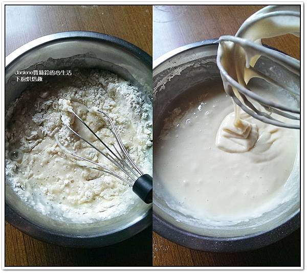 3. 利用任何可以攪拌的器具,將盆內的材料,全部攪拌均勻至黏稠狀,如右下圖